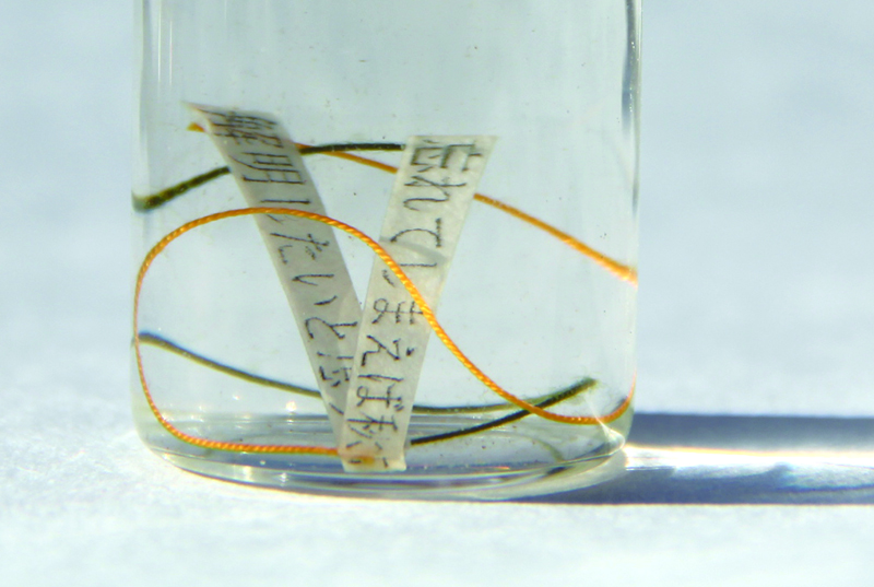 在作品『意拾遗』中,将书本进行了解体,从这里面可以得出,残留在印象中的言语组合或选出自己突然想起的言语,开始认真地进行了保存。为了表达从言语中感受到如绘画般的感觉,使用了刺绣线,将「颜色」与「长度」作为要素进行了组合。通过将其泡在水里保存,使文字产生劣化,由此现象可以观察到不由自己恣意的言语地变容。